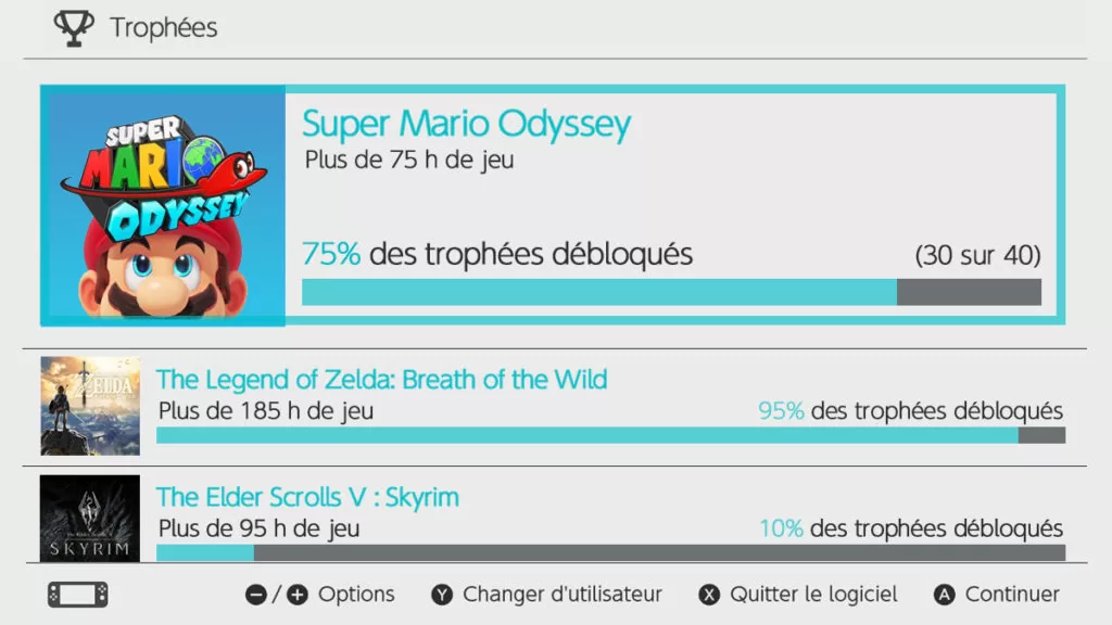 Pourquoi pas intégrer à la Switch et aux jeux qui la composent un système de récompenses et trophées, que l’on obtient en complétant des objectifs précis. Ces succès seraient ensuite partagés sur notre profil Switch et visible par nos amis/autres joueurs. Cela élargirait la communauté Switch et permettrait de développer au mieux les atouts du Online. Certains s’amusent même à créer des interfaces possibles pour cette idée :