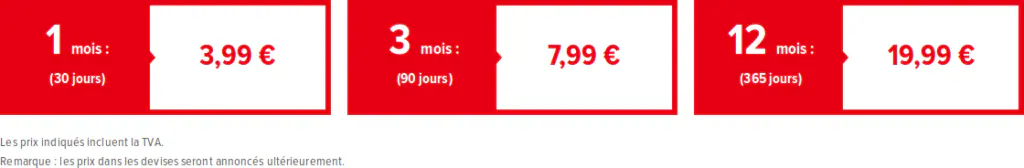 Le tarif de l’offre est déjà connue depuis de nombreux mois, vous avez trois formules d’abonnement en fonction de votre durée d’engagement : un mois (30 jours), 3 mois (90 jours) ou un an (365 jours).