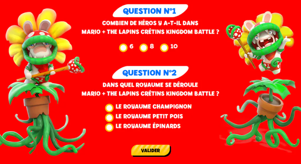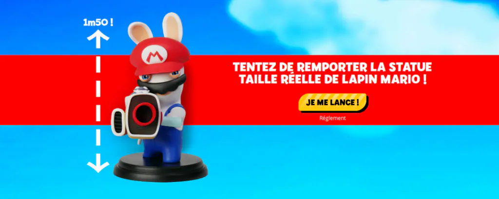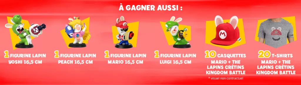Pendant un peu plus de 15 jours, vous avez la possibilité de gagner des goodies Ubisoft comme un Lapin Mario de 1 mètre 50, des figurines Lapins crétins, des casquettes ou des T-shirts en répondant à 2 questions assez simples.
