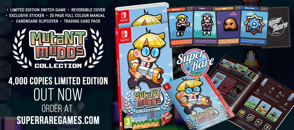 Une version cartouche de Mutant Mudds Collection éditée en édition limitée à 4k exemplaires par Super Rare Games ! En plus de la cartouche dans une jolie boite avec un artwork exclusif, vous découvrirez un manuel de 20 pages, un sticker exclusif ainsi qu’un paquet de 3 cartes à l’effigie du jeu.