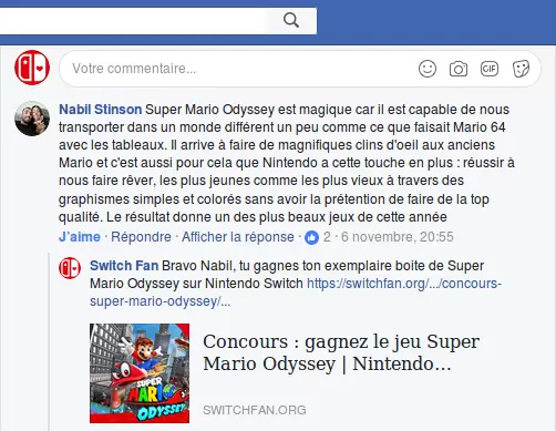 Commentez le post Facebook dédié au concours et indiquez en quoi Super Mario Odyssey est magique.