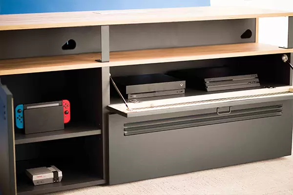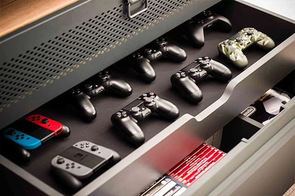 • Un tiroir incorporant un tapis en mousse pour poser délicatement ses manettes ou les brancher directement aux consoles sans les enlever du tiroir