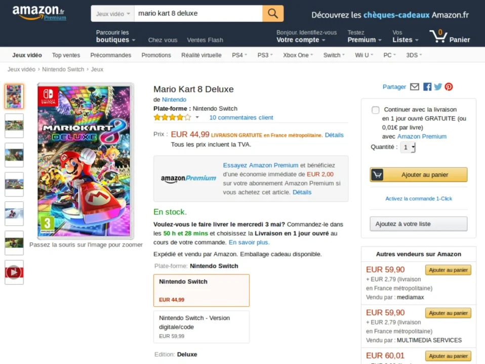 Si vous avez déjà un compte Amazon Premium, vous pouvez acheter la version boite de Mario Kart 8 Deluxe à 44€99.