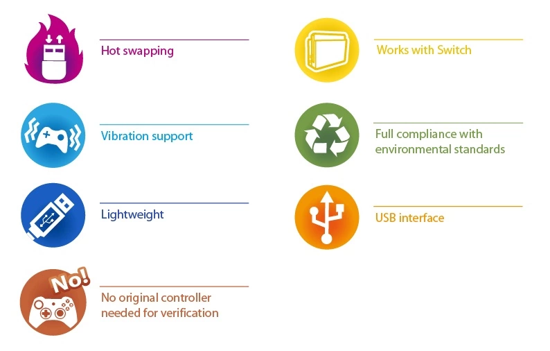 Pour les caractéristiques, c’est assez cool avec support des vibrations, interface USB, des LED, pas de configuration spécifiques à réaliser et un branchement à chaud. La manette se charge de mapper les possibilités de la Switch pour configurer les touches équivalentes.
