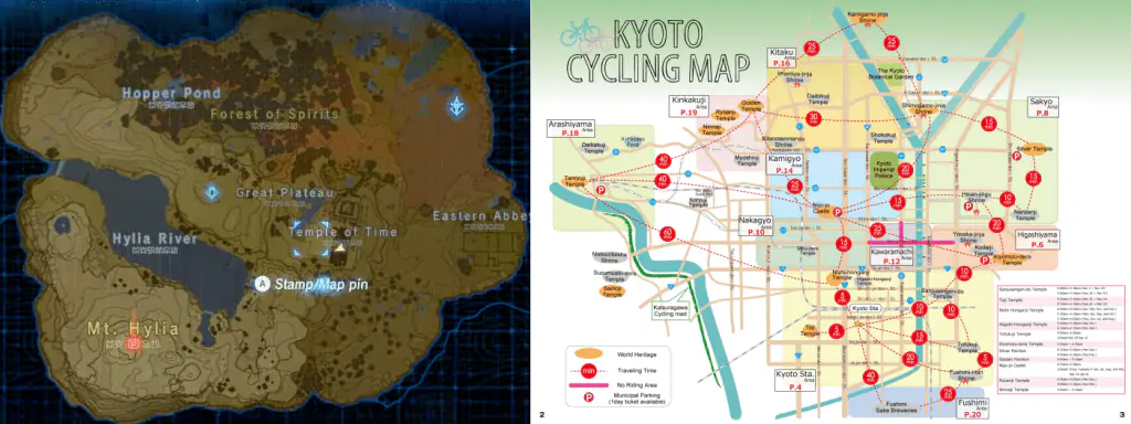 Pour ceux qui possèdent déjà le jeu The Legend of Zelda : Breath of the Wild, les similarités sont plus flagrantes au départ de la quête de Link, autour de la fameuse Tour du Prélude. Comparez la géographie d’Hyrule proposée sur la tablette qui sert de guide, elle n’est pas s’en rappeler le centre historique de Kyōto-shi.