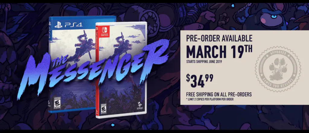 La formule retenue par la filiale de Devolver pour pré-commander The Messenger vous permettra de vous offrir le jeu sans vous soucier des stocks. En effet, les pré-commandes dureront pendant un laps de temps, encore non communiqué à ce jour. Et pour fêter la sortie de leur premier jeu sur la Nintendo switch, l’éditeur a annoncé que les frais de ports seront offerts.