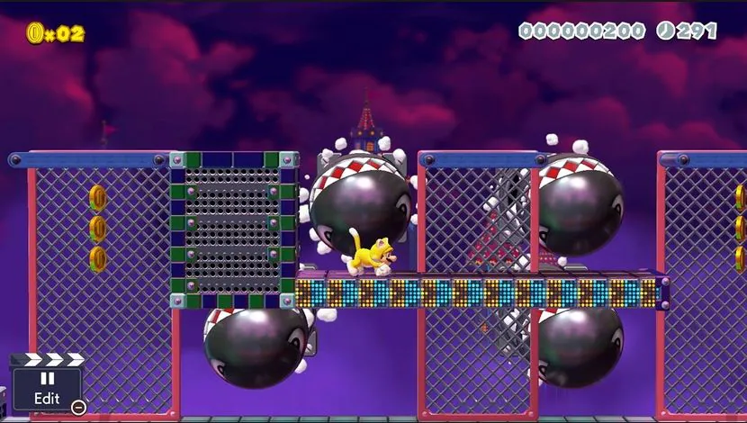 On pourra choisir également si les niveaux sont submergés par l’eau… ou la lave et à quelle vitesse ils se remplissent. La vitesse et l’angle de défilement automatique des niveaux fait également partie des options personnalisables, pour faire de vos niveaux de vrais challenges machiavéliques. Il sera aussi possible de créer des niveaux verticaux ou des pièces secrètes sans défilement automatique. Les ennemis ne sont pas en reste et on pourra utiliser les Bill Bourrin en ligne droite ou à tête chercheuse et les carapaces de Skelerex permettent de surfer sur la lave ou de faire le mort pour mieux revivre sans perdre de vie finalement. Les pièces à forte valeur (10, 30 ou 50) permettront de pimenter encore plus de challenge et d’attirer les joueurs vers des dangers jusque là jamais vus. Pour l’ambiance, de nouveaux effets sonores sont également au programme, pour détourner l’attention ou pour rendre une action vraiment plus sinistre, à vous de choisir.