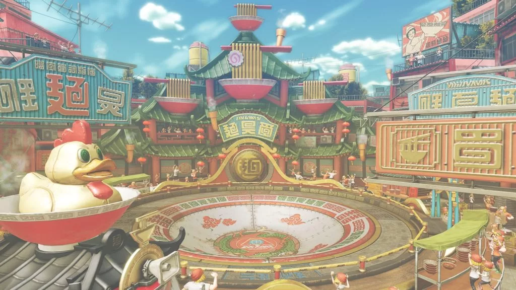 Ramenville, l’arène de Min Min, la folle des ramens… L’arène a donc la forme d’un bol de nouilles !