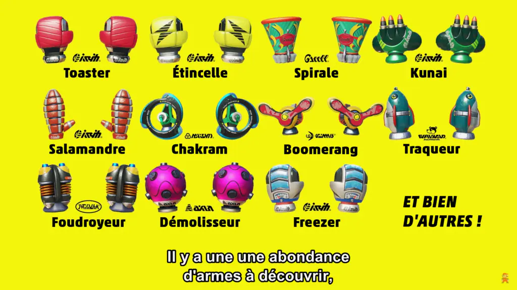 les armes de type boomerang ou à effets : un peu moins puissantes, elles ont des effets de fou qu’il faut apprendre à maîtriser mais qui vous pourront vous permettre de toucher l’adversaire même derrière un obstacle.