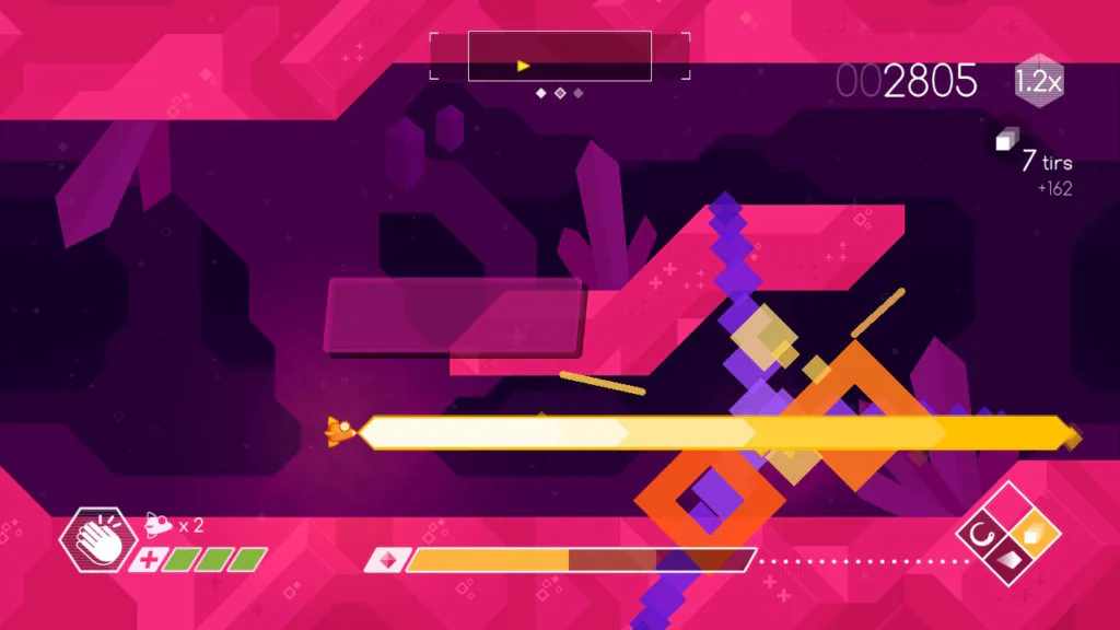 En effet, chaque niveau est divisé en trois phases, permettant de respirer un court instant entre les moments de shooting intense. Le jeu comporte trente-six niveaux, dont les deux tutoriels, à la difficulté progressive par le nombre des ennemis présents simultanément à l’écran ainsi que leur résistance à vos assauts et l’ajout de lasers mobiles ou non dans les environnements qui réduisent nos possibilités de fuite. Chaque ennemi a également un comportement différents, là où certains cherchent uniquement à entrer tranquillement en contact avec notre vaisseau, d’autres usent de projectiles plus ou moins nombreux et d’autres sont tout bonnement explosifs.