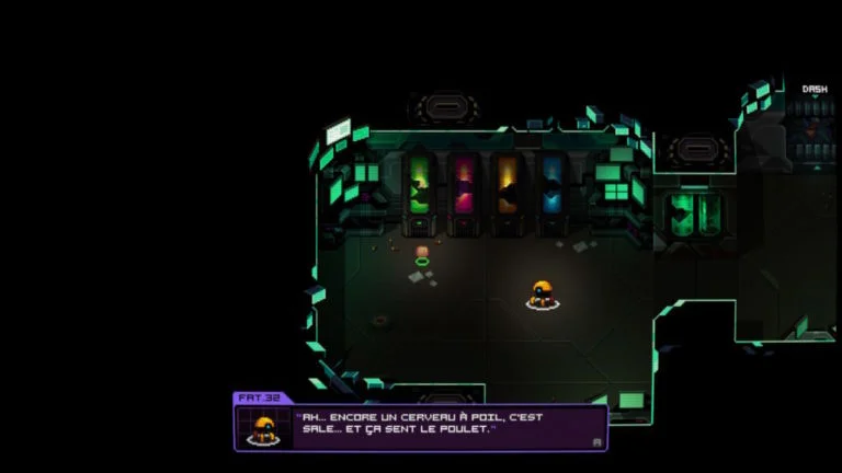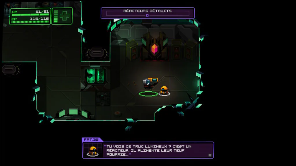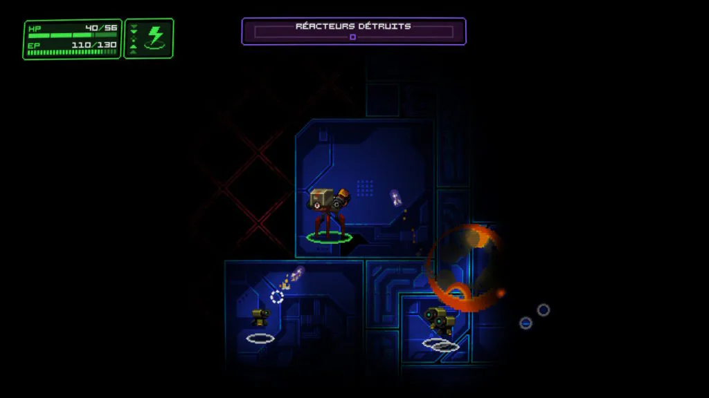L’aspect roguelite du jeu s’inscrit dans la génération aléatoire des niveaux, chaque partie sera donc unique et renouvellera l’expérience de jeu. Les environnements dans lesquels on évolue sont variés, colorés et délicieusement conçus en pixels titillant un peu la nostalgie des trentenaires ayant connu la SNES. Il est plaisant d’évoluer au gré des labyrinthes à la recherche des réacteurs et des ennemis. Les explosions, tirs et ennemis à l’écran, qu’ils soient nombreux ou non n’interfèrent pas avec le rendu visuel fluide et ultra réactif du jeu. Les développeurs ont soigné leur jeu et c’est plus qu’appréciable, d’autant plus qu’il est rempli de commentaires plein d’humour qui sauront vous réconforter lors d’échec cuisants. La bande-son vient terminer de nous plonger dans cette ambiance futuriste ou le danger nous guette à chaque coin de niveau et on en redemande.