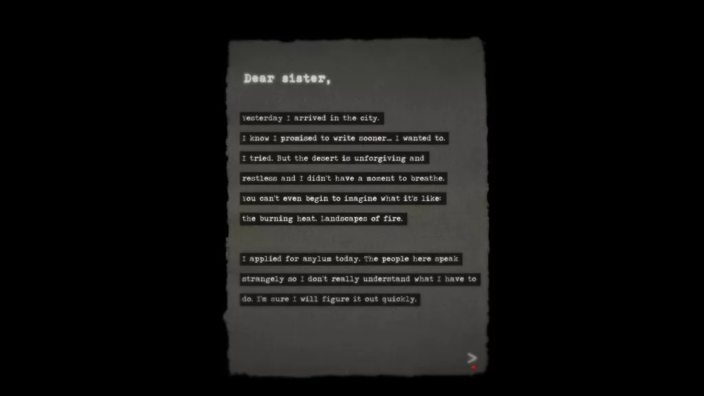 North commence par vous prévenir qu’il est conçu pour être joué en une session de jeu, ce qui prend environ une heure pour le premier essai. Nous voici donc lancés dans une expérience vidéo-ludique hors du commun. On incarne un homme qui a traversé le grand désert pour attendre une grande ville du Nord. Il vit en colocation avec d’étranges créatures et a obtenu un travail difficile physiquement et pas très gratifiant. Il envoie des nouvelles régulièrement à sa sœur restée dans le Sud.