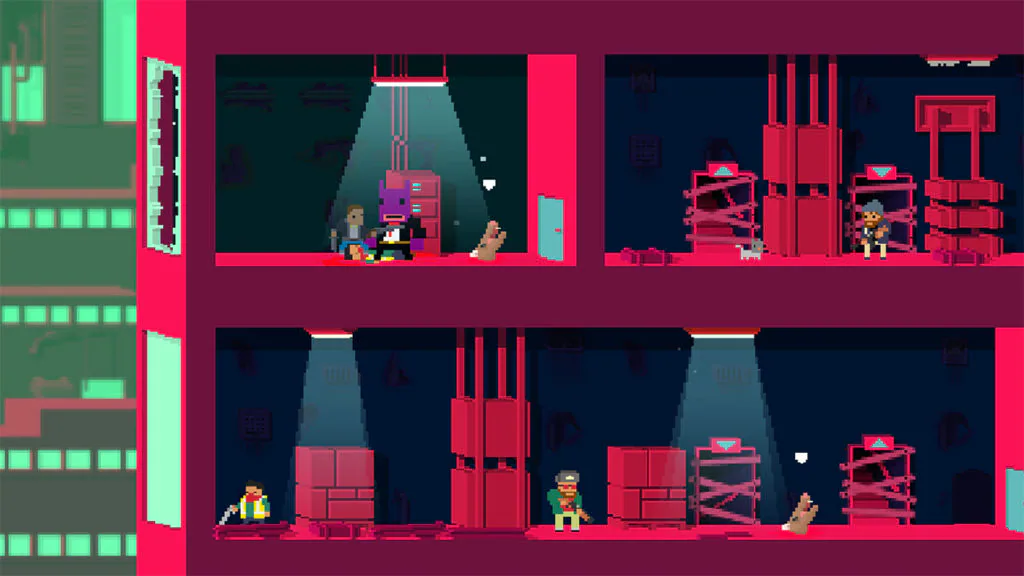 Les ennemis sont aussi impitoyables qu’ils sont variés, certains vous stoppant avant que vous puissiez les renverser et d’autres vous repoussant avec des projectiles explosifs. Tout se finit de toute façon de la même manière, dans un bain de sang pixélisé. Tout va très vite, il faut trouver des parades rapidement, ne pas rester à court de munitions et penser à récupérer quelques armes secondaires comme des grenades, des tourelles, des chats entourés d’explosifs ou encore de balles qui explosent au contact des protagonistes. Tout est fait que l’on prenne un malin plaisir à tout faire exploser et ça fonctionne vraiment.