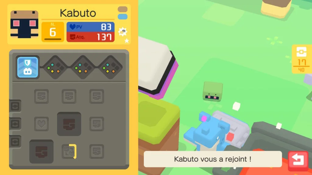 Un autre type de Gemmes-P servira à booster vos attaques. C’est grâce à cela que vous pourrez faire progresser vos pokémons et les faire évoluer. Il existe un autre moyen de les faire progresser : l’exercice. Cet entraînement intensif vous permettra de faire gagner des niveaux plus rapidement mais aussi de changer les capacités des bestioles. Mais vous devrez pour cela « sacrifier » d’autres pokémons. Au bout du périple, une rencontre inattendue vous rappellera bien des souvenirs.