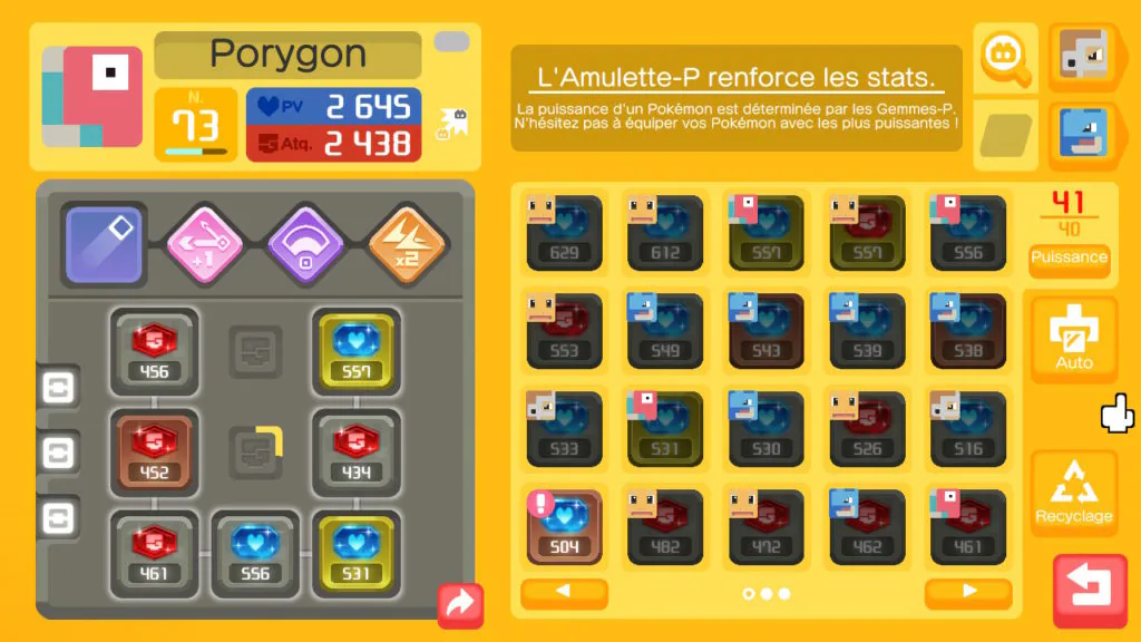 Il y a en tout 11 zones à explorer (plus une à révéler). Chaque zone est composée de 6 niveaux, le dernier étant la confrontation avec le boss de la zone. En battant ce dernier, vous obtiendrez une statue. Ces mastodontes rocheux vous ouvriront la voie vers cette fameuse douzième zone. C’est dans les niveaux que vous allez pouvoir obtenir vos Gemmes-P ainsi que les divers ingrédients pour vos soupes maison. Les Gemmes-P sont des cartes que vous allez accrocher à vos pokémons. Il en existent 2 sortes : les Gemmes-P d’attaque et les Gemmes-P de défense.