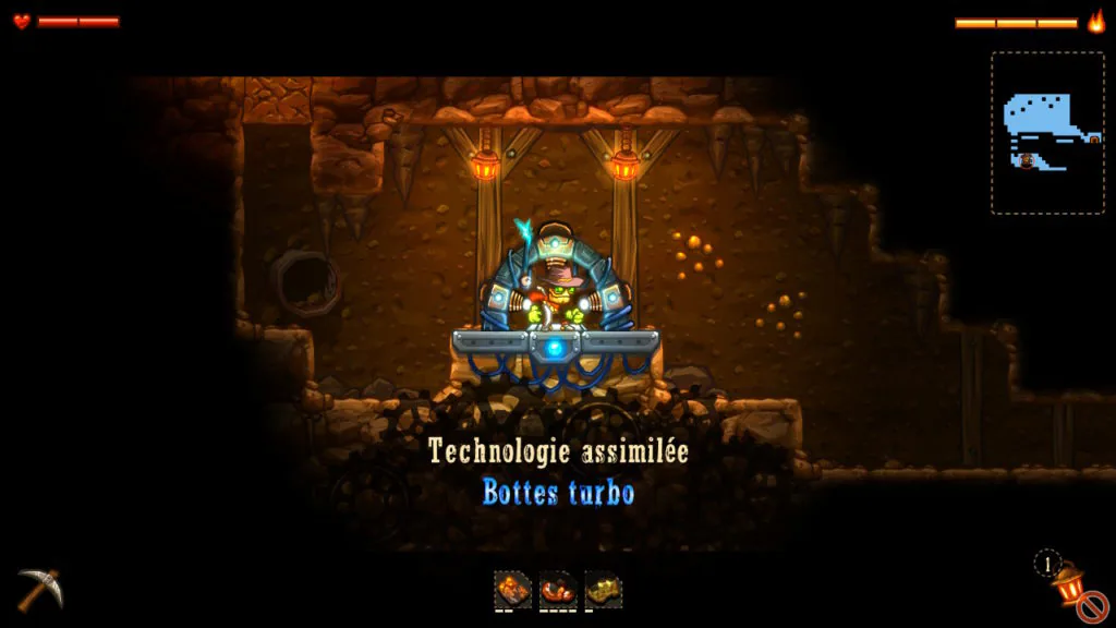 Des objectifs apparaissent au fur et à mesure que l’on descend au plus profond de la mine. On découvre alors des cavernes où des portes sont verrouillées. Un peu de recherche permettra alors de trouver les leviers permettant d’ouvrir ces portes et avec elles un nouveau morceau du monde souterrain. On ne s’ennuie finalement jamais et on garde toujours l’envie de voir grandir l’inventaire des outils de Rusty et le voir évoluer de plus en plus agilement dans ce monde.