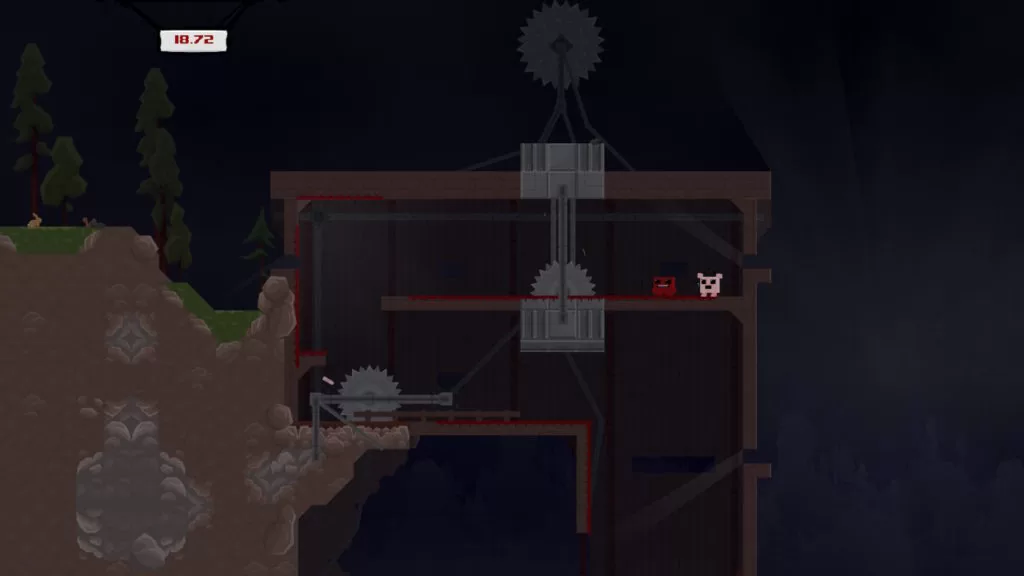 Les graphismes cartoons à gros traits de Super Meat Boy sont sa marque de fabrique depuis sa première apparition en 2010 et même si rien n’a changé depuis (c’est le même jeu, après tout), le tout reste agréable et lisible. Les environnements sont cependant plutôt ternes mais c’est pour mieux voir ressortir le rouge de l’hémoglobine qui se répand lors de vos échecs cuisants. Les scénettes qui content les mésaventures de Meat Boy et Bandage Girl sont remplies d’humour, souvent violent et/ou gore, on vous aura prévenu. On reste donc dans le thème du steak qui fini haché et dégoulinant avec les bruitages qui sont en totale adéquation. La bande-son fait bien son job en rythmant la progression sans pour autant agacer.