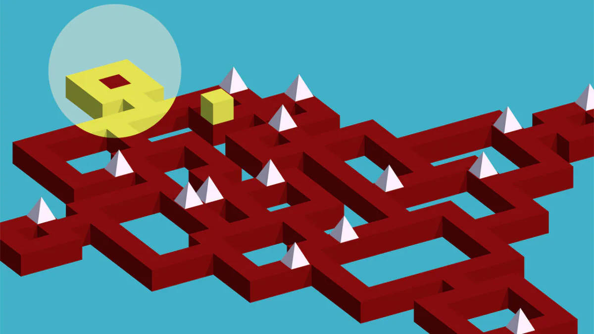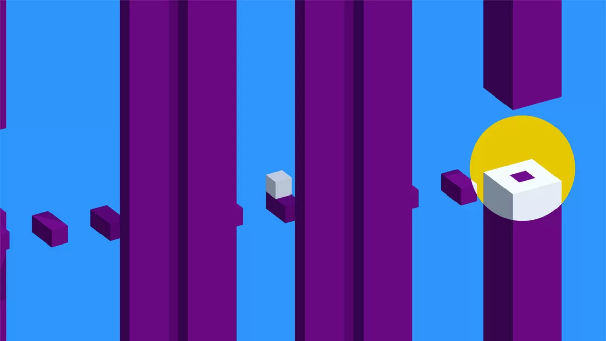 On dirige le cube avec le stick gauche ou les boutons du Joy-Con gauche (ou la croix de la manette Pro) dans ce monde en vue isométrique. Droite, haut, droite, droite, haut, haut, pause… On prend rapidement nos marques et on avance tranquillement dans les niveaux à l’affût des pièges placés par les développeurs. Les plateformes se déplacent, disparaissent, des pics apparaissent pour faire voler notre pauvre petit cube en éclats, il faut donc une attention de tous les instants.
