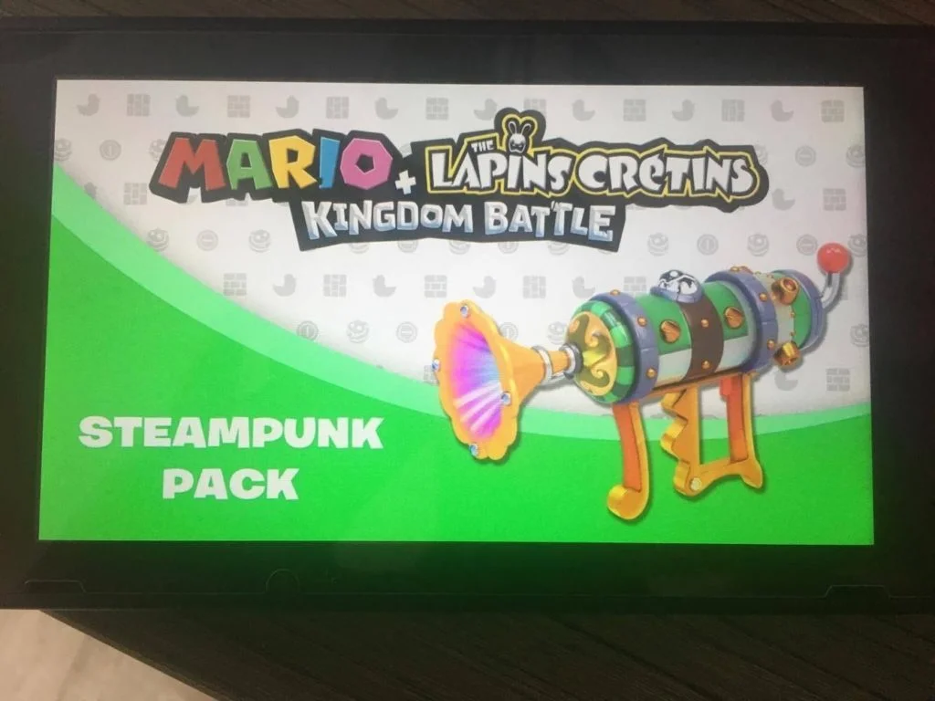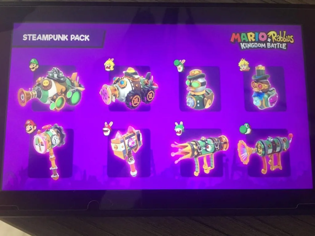 Voici le contenu du pack Steampunk : 8 nouvelles armes dédiées aux héros de l’aventure Mario + Lapins crétins.